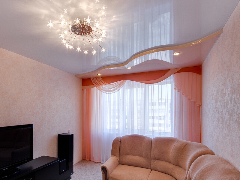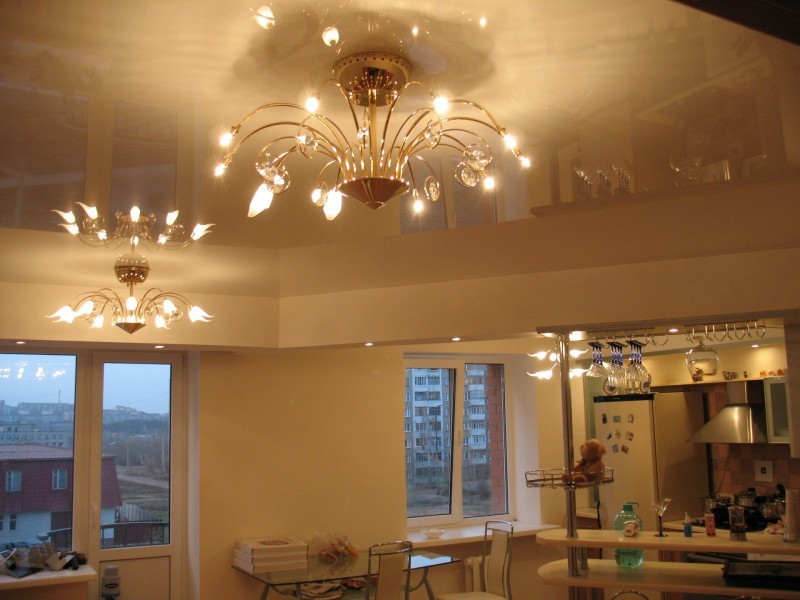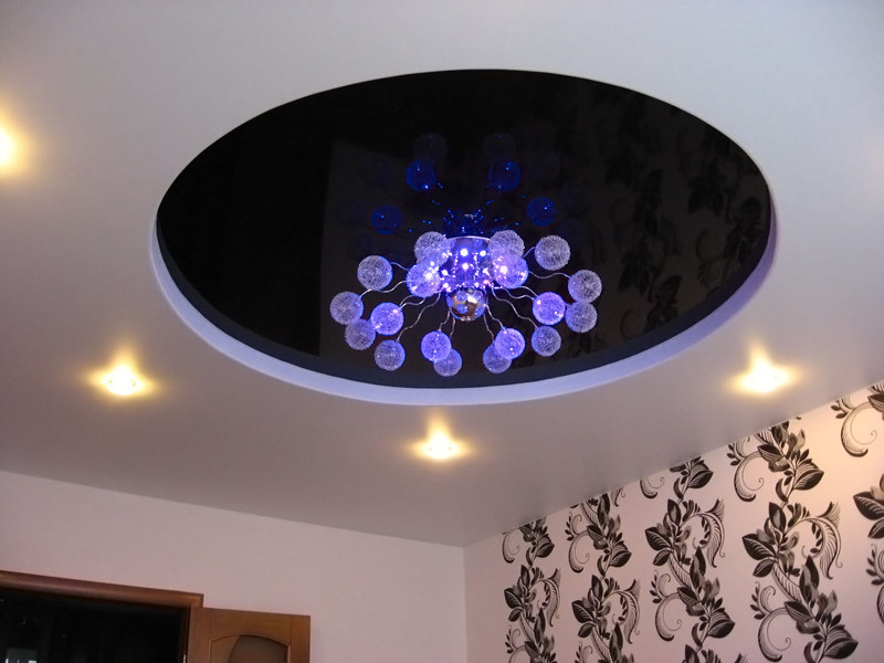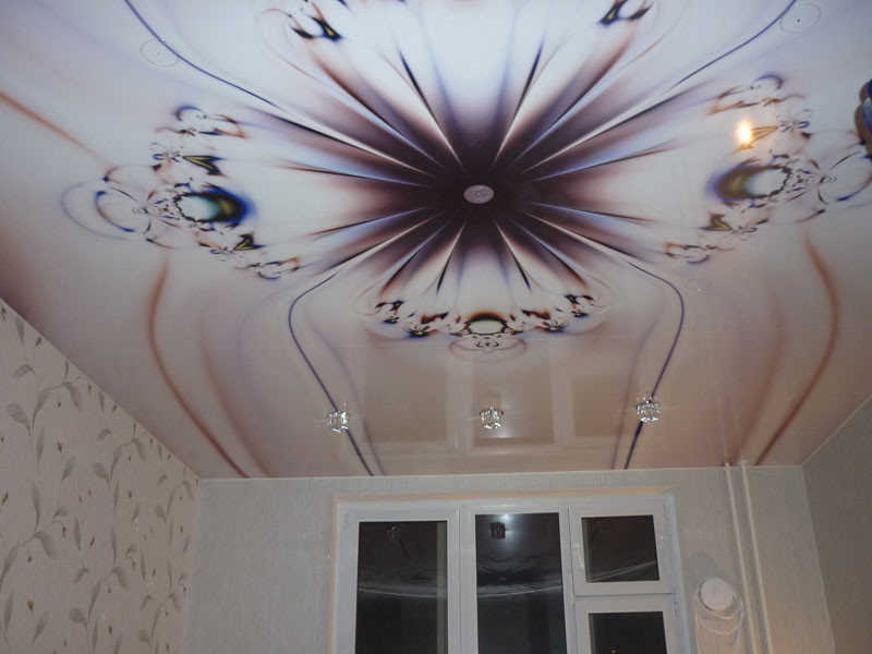 Натяжной потолок 11кв. м. Матовый или глянцевый на Ваш выбор. На материал нанесена фотопечать(картинку можно выбрать на сайте "шутерсток" или предоставить свою). Установлена люстра и 6 точечных светильников. Цена потолка под ключ 29700 руб.