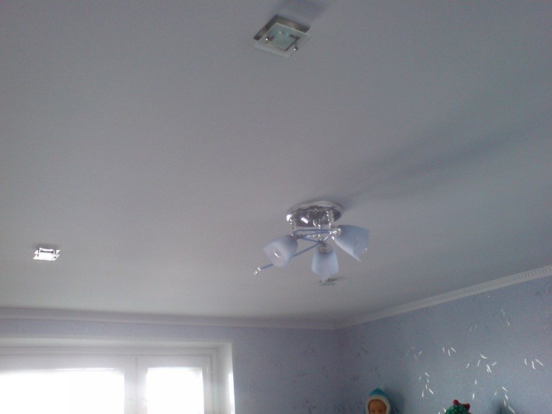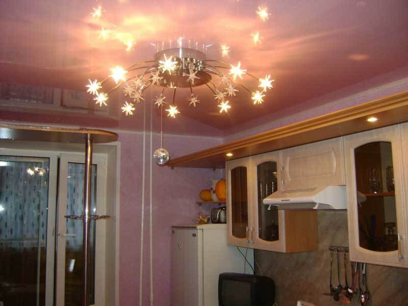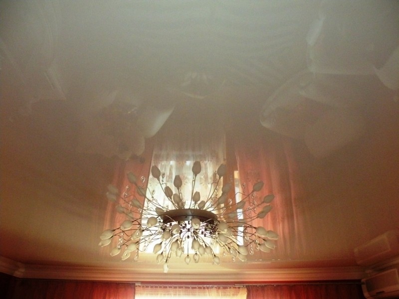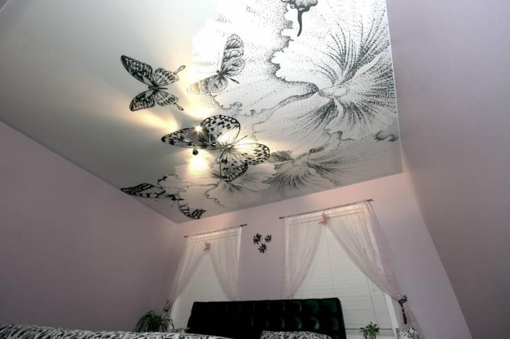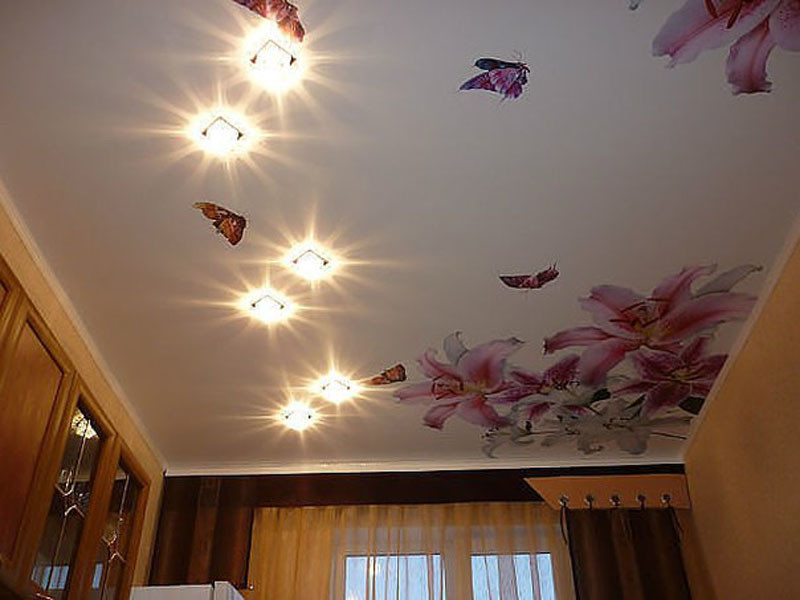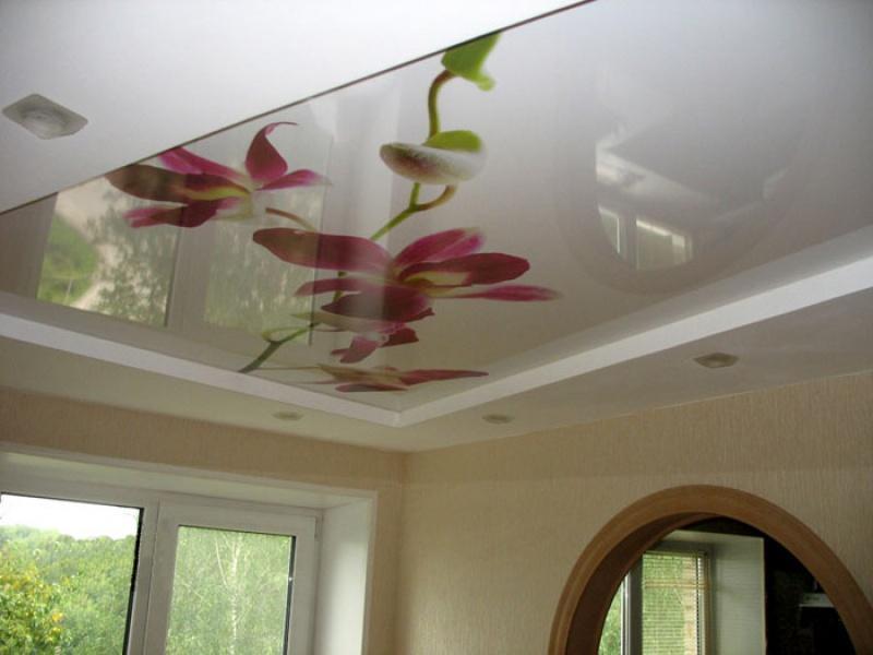 Натяжной потолок 11кв. м. Матовый или глянцевый на Ваш выбор. На материал нанесена фотопечать(картинку можно выбрать на сайте "шутерсток" или предоставить свою). Установлена люстра и 6 точечных светильников. Цена потолка под ключ 29700 руб.